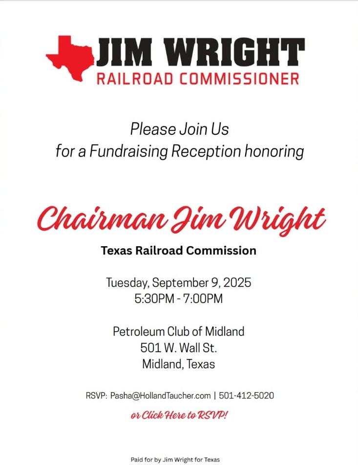 Please join us for a Fundraising Reception honoring Chairman Jim Wright of the Texas Railroad Commission. Click here for full event details.